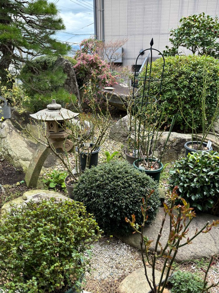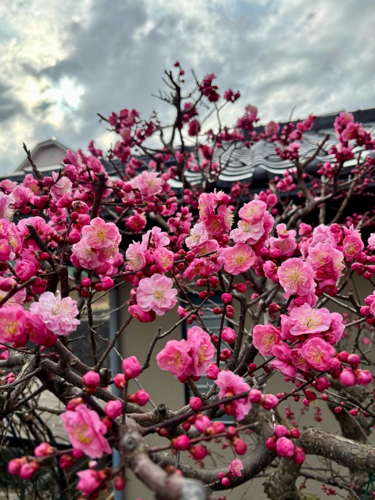 ☀️☁️お天気3日続きの今日の庭🌸紅梅がどんどん咲いてく😍バラの芽吹き消毒完了💪液肥もたっぷり👌庭作業も春も進んでいく🎵💕