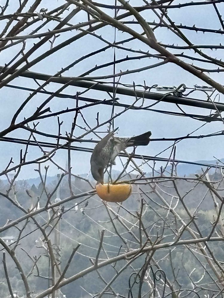 メジロが可愛くて、余った柚子や落ちたミカンを庭に置いてたら、いつの間にかヒヨドリが占拠してしまいました。庭の木に止まって、ミカンを待っています。昨年の秋から今まで 様々な赤い実はすべて食べられてしまいました。🥲