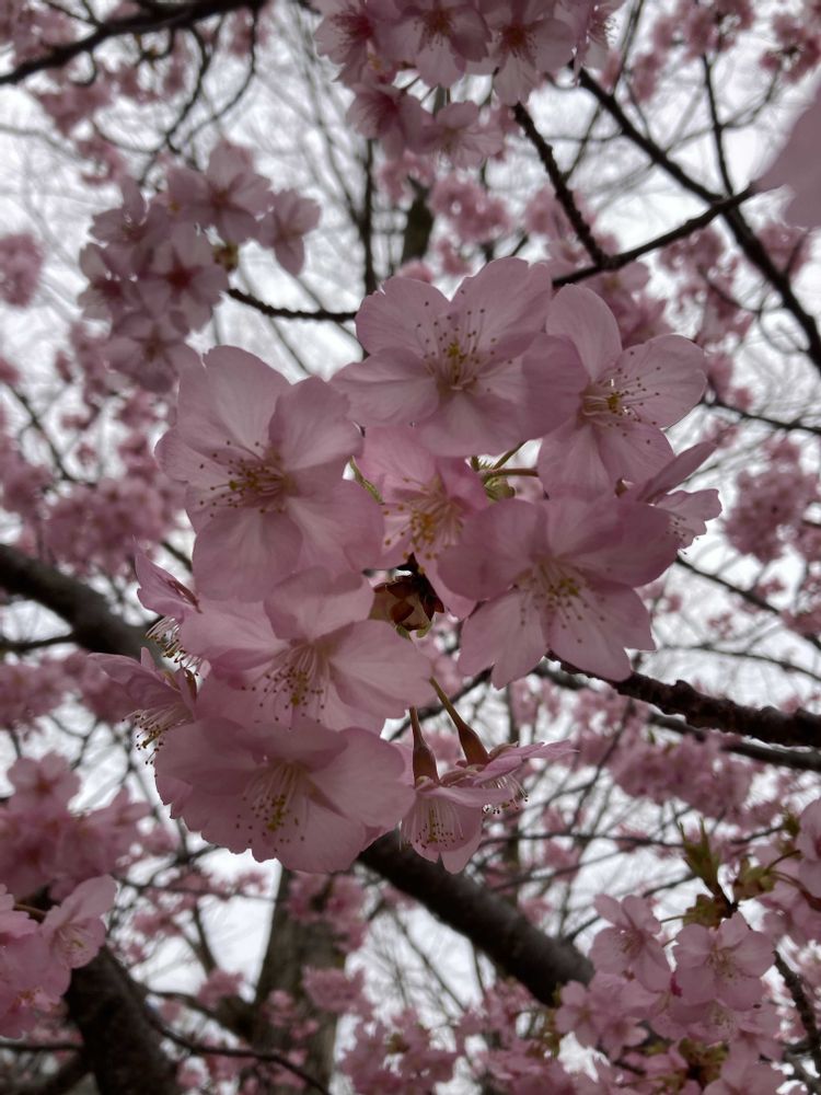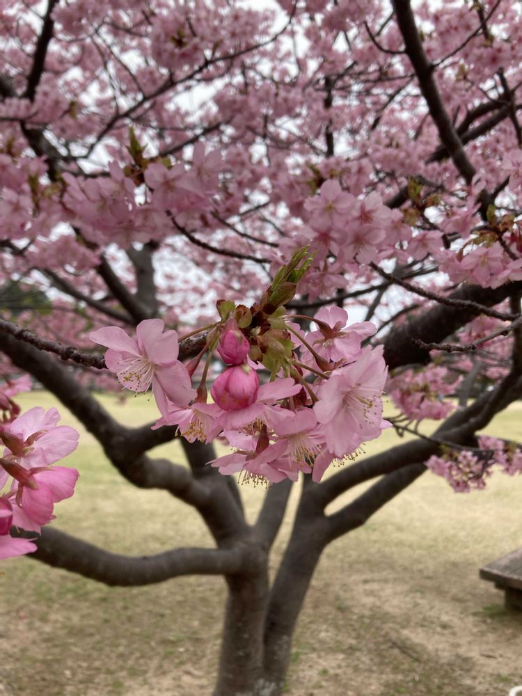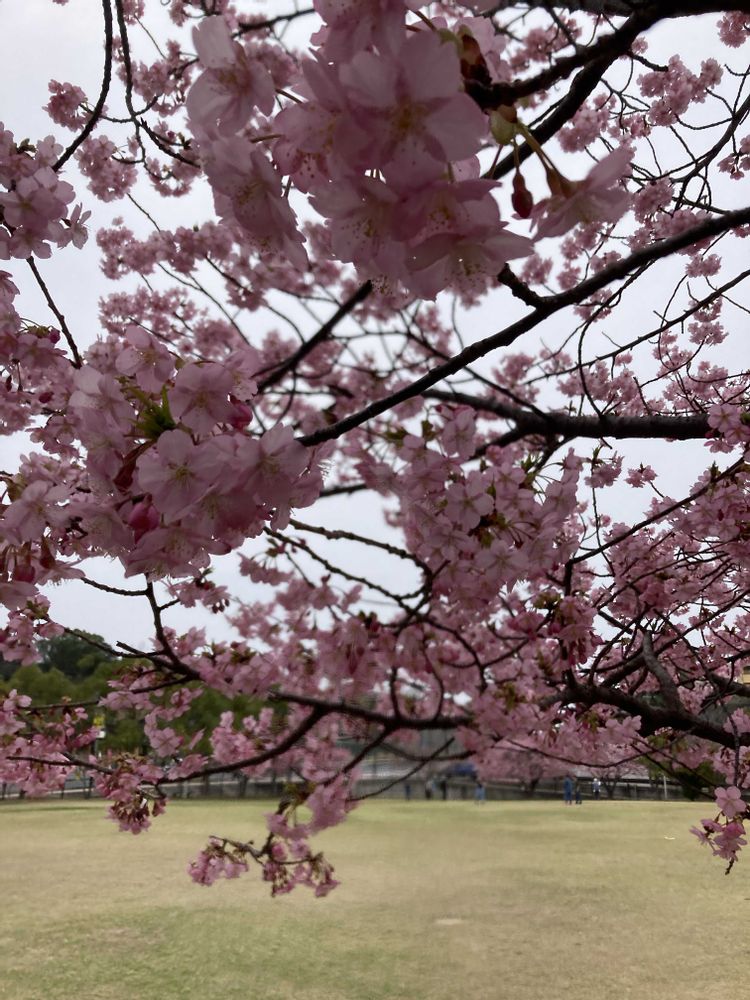 河津桜(カワヅザクラ)が咲いていました♪公園では、桜を楽しむ人達が訪れていました。空が青かったらもっと綺麗だったことでしょう。