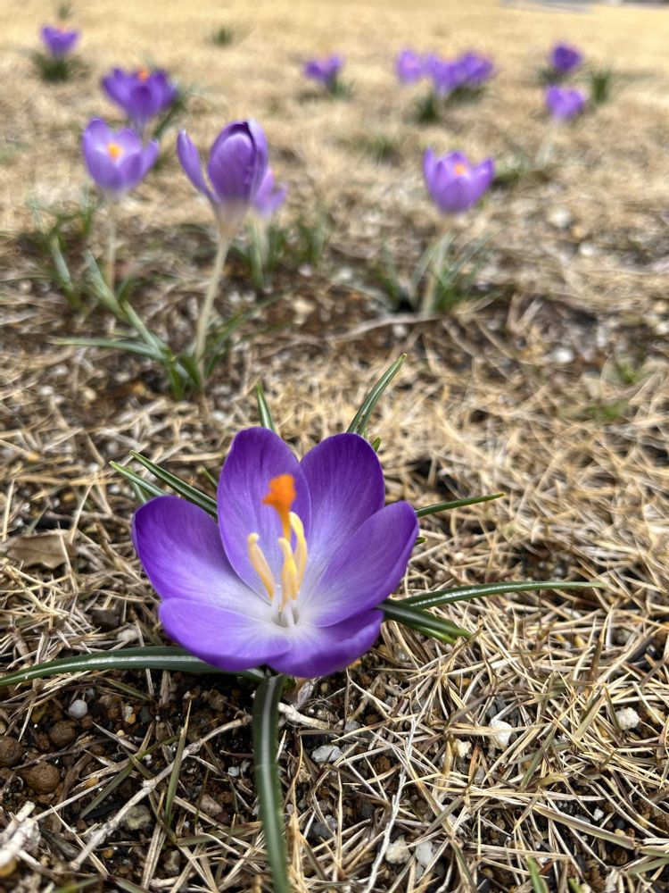 芝生からピョコピョコ咲いてるクロッカス💜✨新しいですね♬