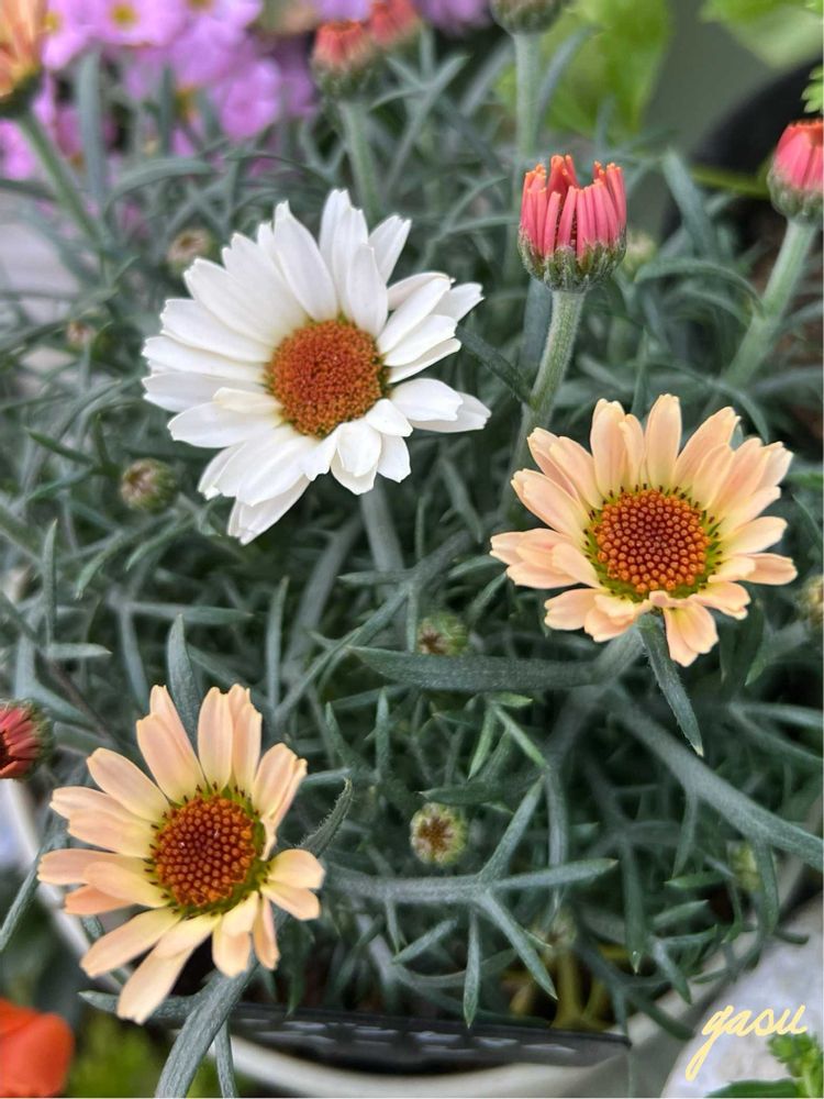 ③秋にタイミングを逃し、年が明けてから剪定した穂を挿していたオステオさんも何輪か咲いてます♪ まだしっかり着いてるか不安なので鉢はまだ水を張った器に😅