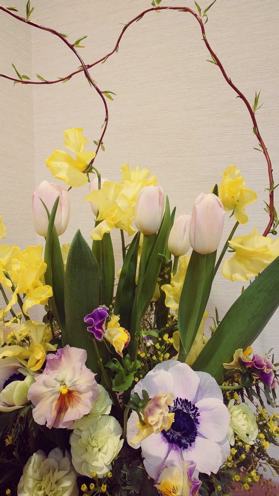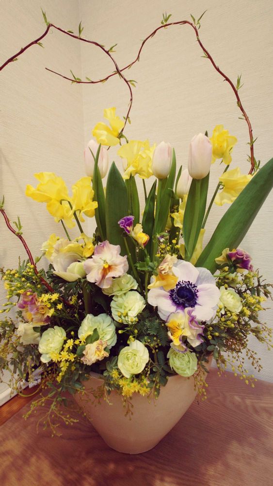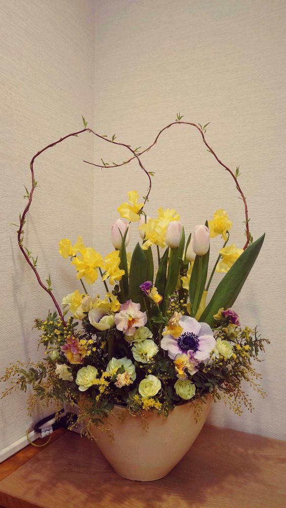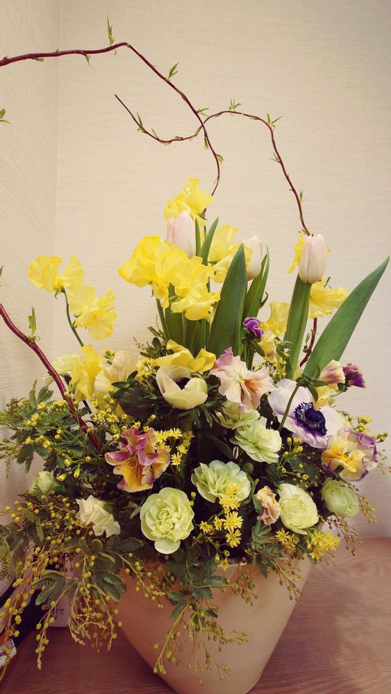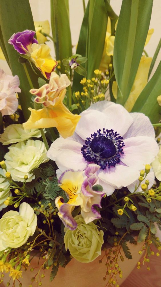 今日はピンクのアネモネと黄色いスイートピーが可愛らしいアレンジです🥰