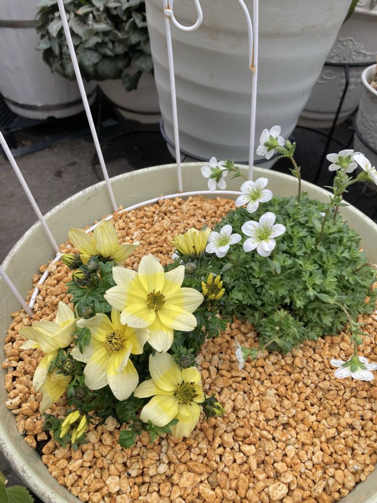 お迎えした ビデンスとクモマグサですが ひとつずつ植えたかったけど ちょうど良い鉢が無く 土も足りなくて こんな植え方してしまいました💦 もっとよく考えて次のお休みまで待てばよかったナ( ´•ᴗ•ก)՞ ՞ やり直したいナ┏(ꒉ:)و ̑̑ テヘッッ