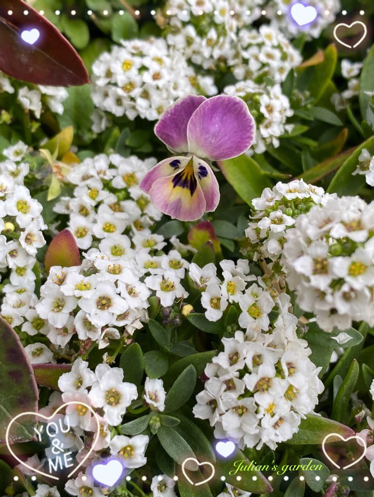 ⑤白いお花 アリッサムを🤳していてあらら 雨が降ってきて 困った顔をしているビオラ 「チュチュの約束」がいたので パチリ✨ 早く晴れてくれると良いね〜😉