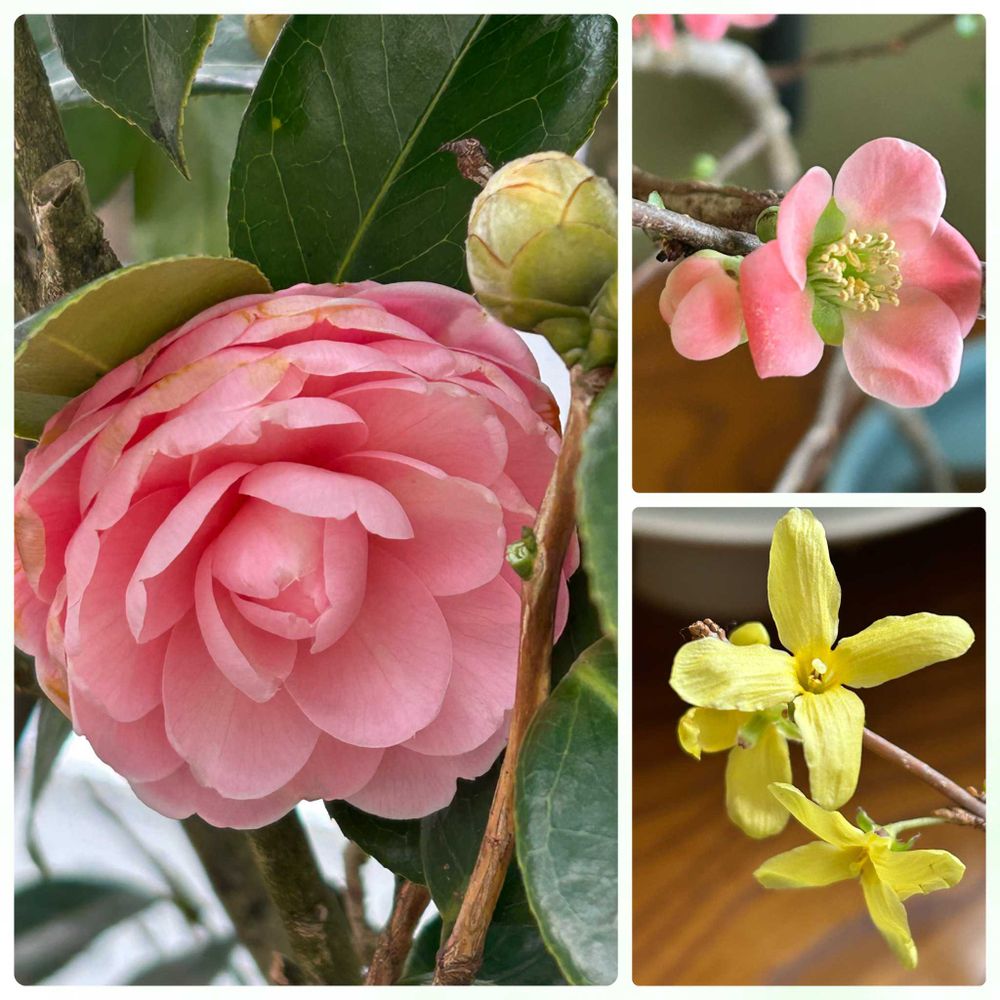 ①庭に咲く乙女椿とお稽古花。春色見つけました。🌸🌼