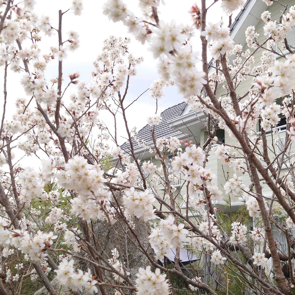 🍒サクランボの花🌸があっという間に開花して、今朝も🐦️さんとか集まってました〜今年は沢山実がなると良いんだけど、、、!