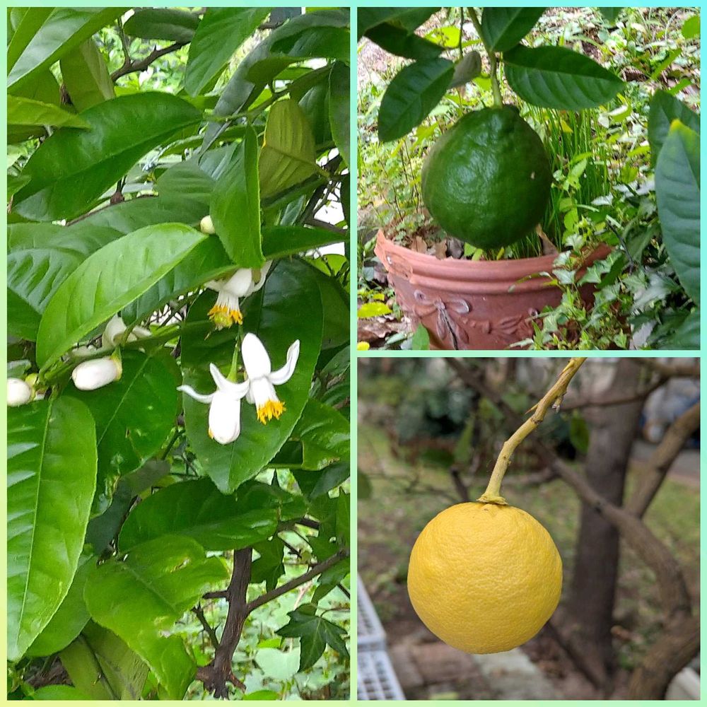 ③仕事で行っている学校の鉢植えのレモンの木で、5月のお花、9月に撮影のまだ緑色の実、現在の黄色に熟したレモン🍋です
