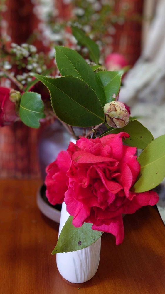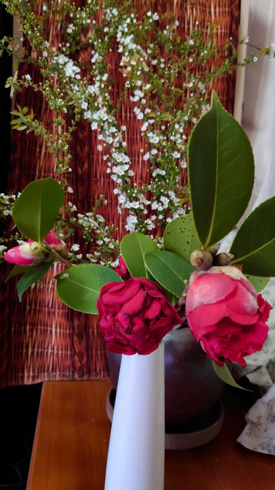 八重椿とユキヤナギのコラボ