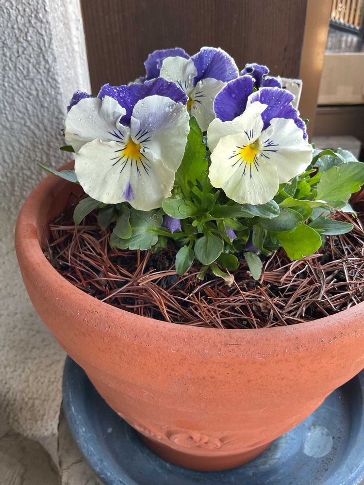 パンジーさん マリア・ブルーオーシャン、ずっと 冬の間 縮こまっていましたが、やっと 咲き出しました〜💖✨✨