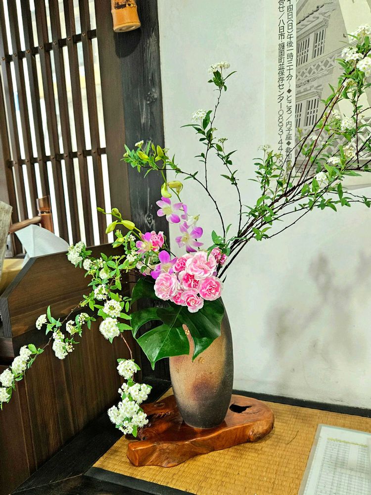 5️⃣和菓子屋さんの店先の生け花(コデマリ、カーネーション)