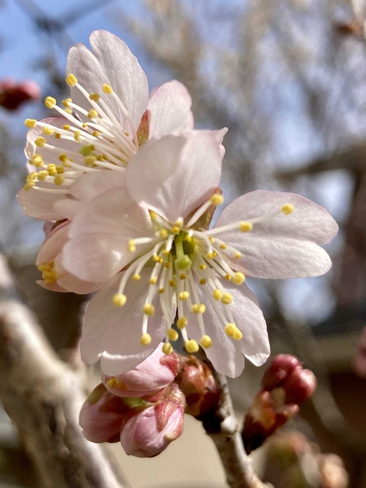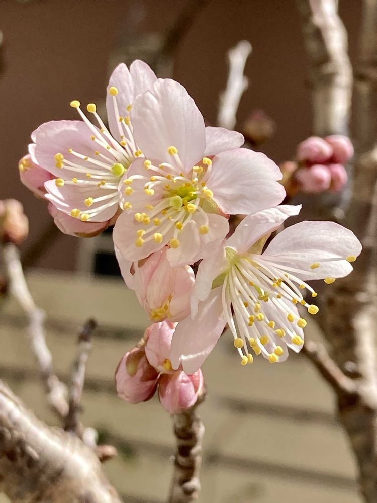 ①②この暖かさで庭の花梅が一気に開いてきました③④さくらんぼも咲き始めました。