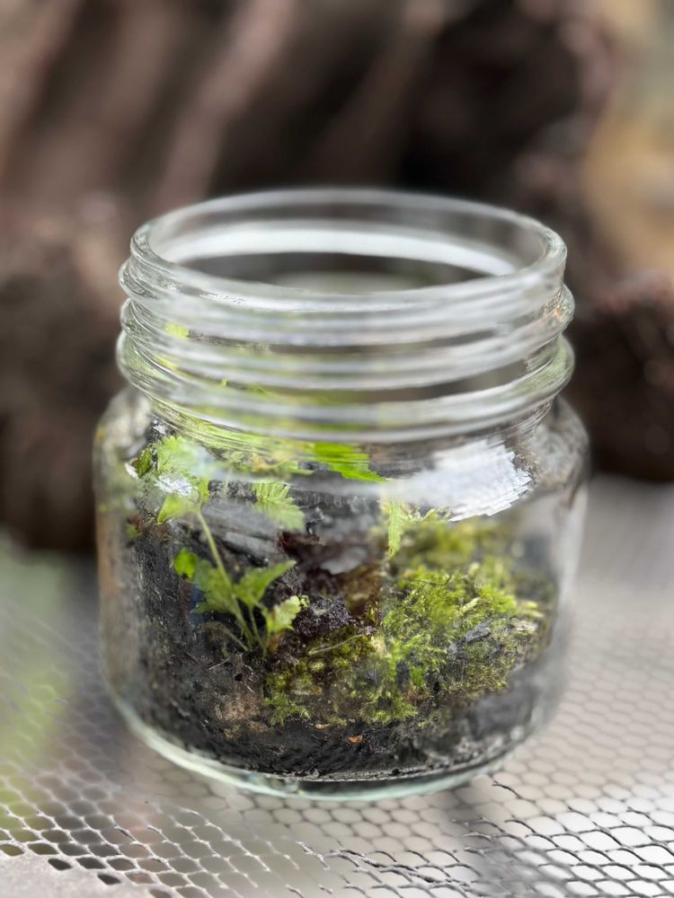 ③ビニール袋に放置していた炭に小さなシダが生えていました 緑が綺麗だったのでそこら辺の苔や石集めてにわかテラリウム