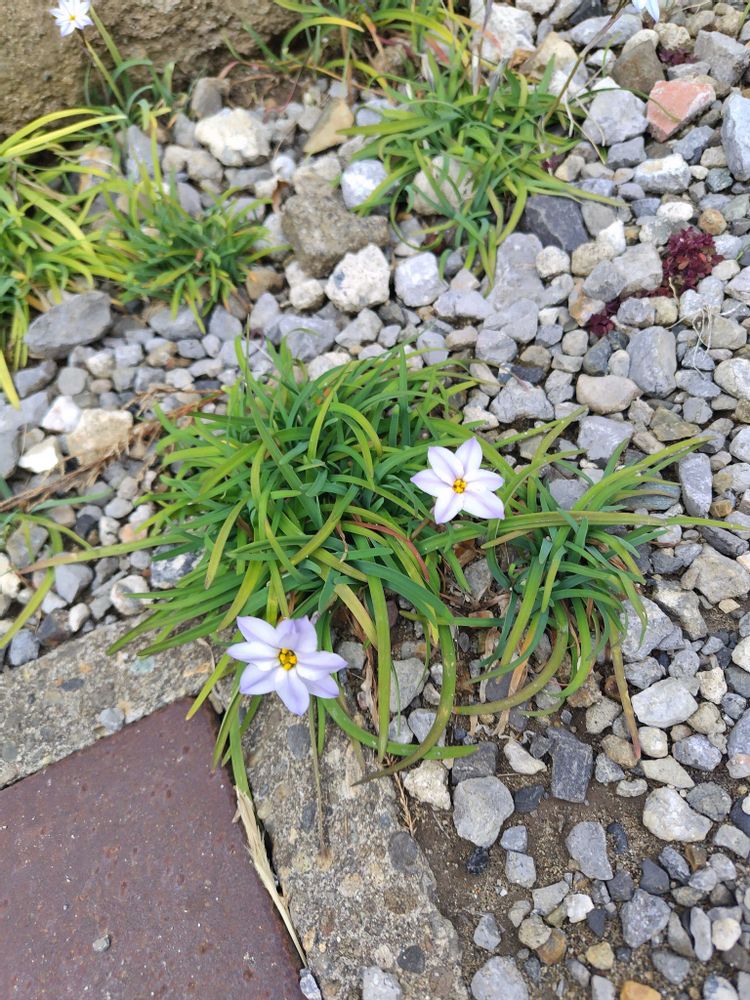 ユリ科の耐寒性秋植え球根植物の"イフェイオン"別名"花韮(ハナニラ)"の花ですね。地を這う様に伸びる葉の間から,花茎を沢山立ち上げて,6弁の星形花を付けるので人気があり,グランドカバーや花壇の縁取りによく植えられます。葉と球根にニラ臭がある為,ハナニラの和名が付きました。日向と水捌けの良い用土を好みますが,強健で,半日陰でもよく育ちます。花後に追肥しますが,球根は植えたままでよく,夏は葉を枯らして,休眠します。