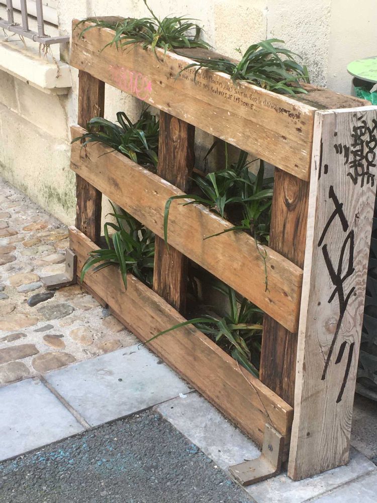 道のゴミ箱の隣にパレットが捨ててあると思ったら、プランツ🌱が中に入ってたよ。🤣これって有り?しかもしっかり地面につけてるし。👀 驚いた。