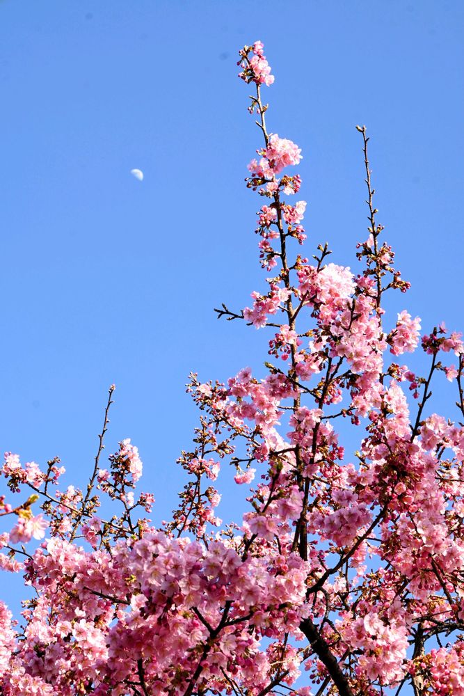 公園の河津桜の梢の向こうに昼の月が出ていました。