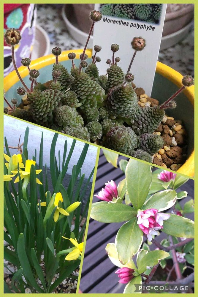 1枚目は、ちまちま屋さんで購入した軽石鉢。冬の間、消えたかのように見えていたツメレンゲもぷっくりしてきました💕