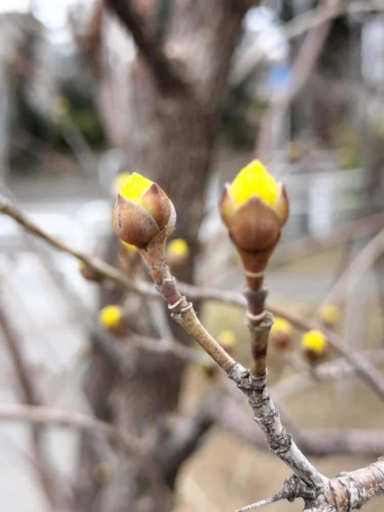 公園のサンシュユや街路樹のモクレンが咲きだし