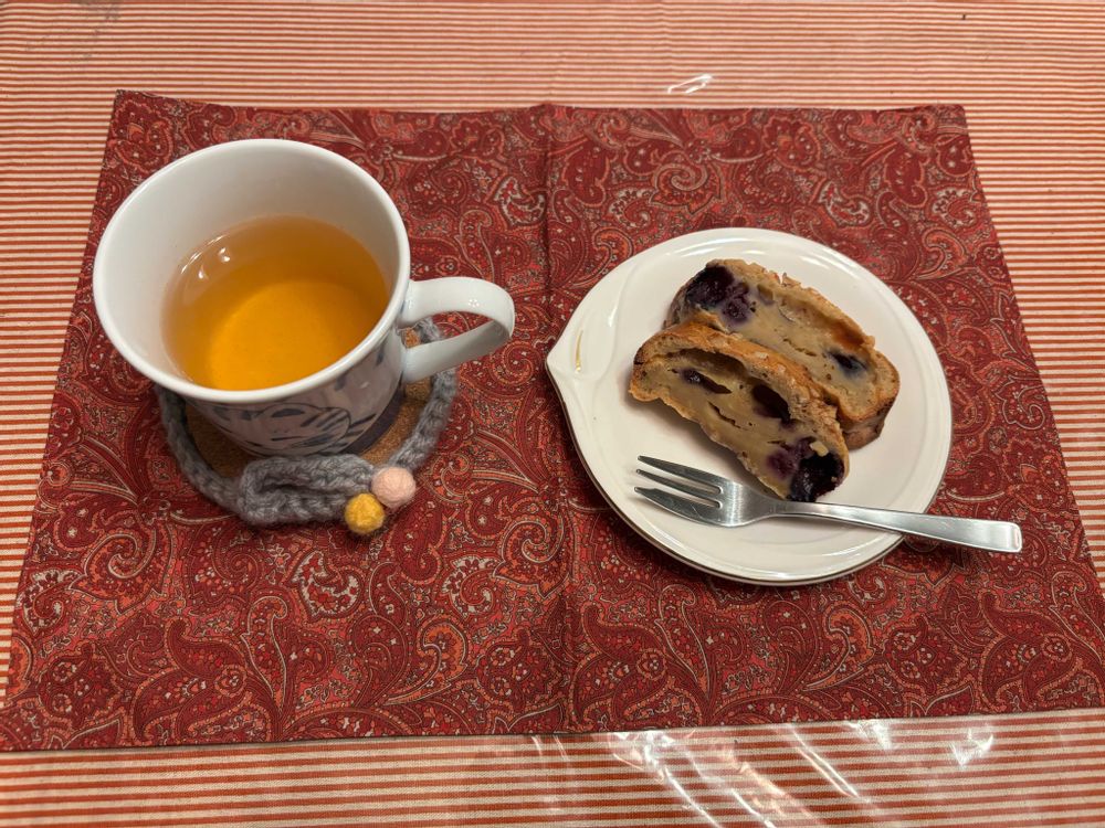 ティカップのコースターはGS友さんの編み編みのニャンコの尻尾コースターです🐈⬛♥️