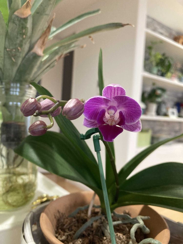 何年越し?7?8年?もう忘れてしまうくらい全くお花が咲かなかったミニ胡蝶蘭の花が咲いたー🎉逆にどうして咲いたの?普段と変わらないお世話しかしてないのに😳うれぴぃ🎵