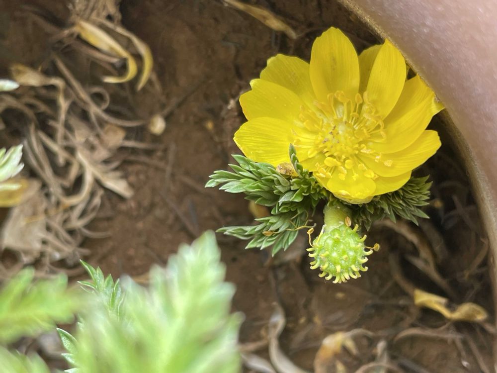 ④昨日のフクジュソウで③の左下の子 お花も葉も小さく控えめな成長です🌼