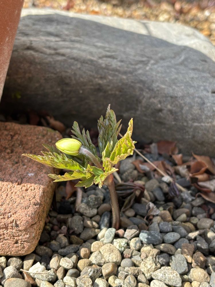根というか、地下茎で広がります。花壇の縁どりの石の下を潜って、庭の砂利敷きのところにも出ています💦