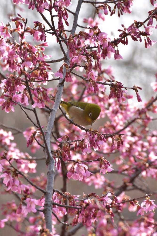 2025/03/14、『鶴見緑地』で撮影したオカメ桜にメジロ。