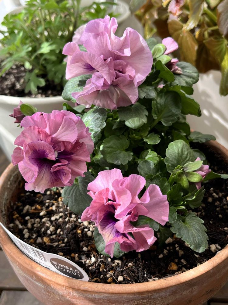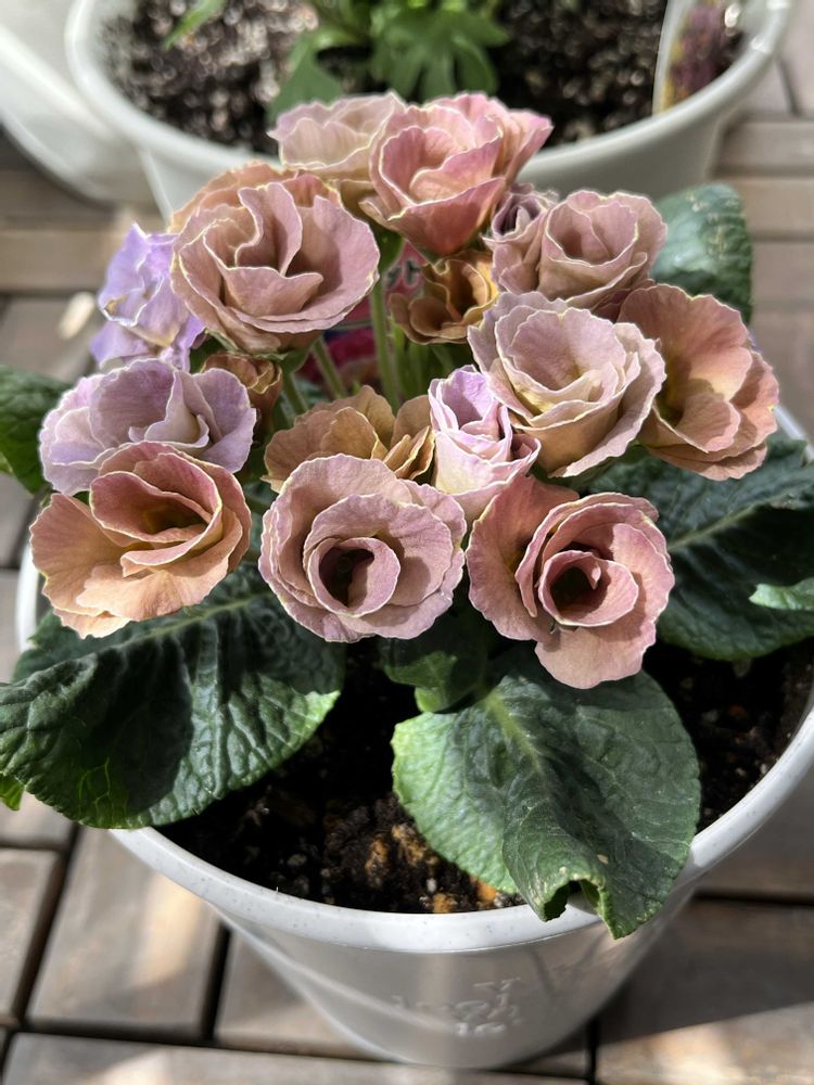 こんにちは✨快晴です☀️昼過ぎて気温17℃で暖かいです😊 1️⃣プリムラポリアンサ・コロネット🎀 アンティークな色合いが🎵お気に入りです🥰 2️⃣カネコ種苗のフリル咲きパンジークラッピング✨花がボリュームあって可愛いです🎶 3️⃣見元園芸つぶらなタヌキ✨青空に向かって背伸びしてるみたい😆