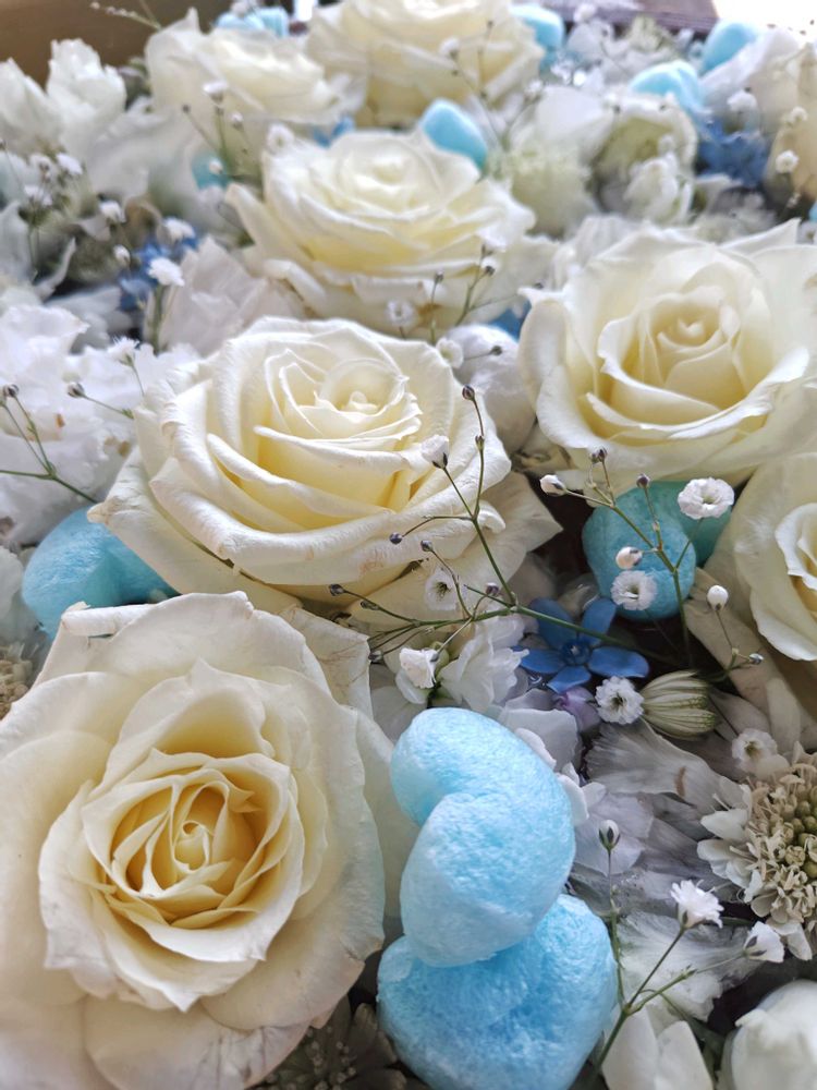 白い薔薇🤍と水色🩵が品良く ステキですね