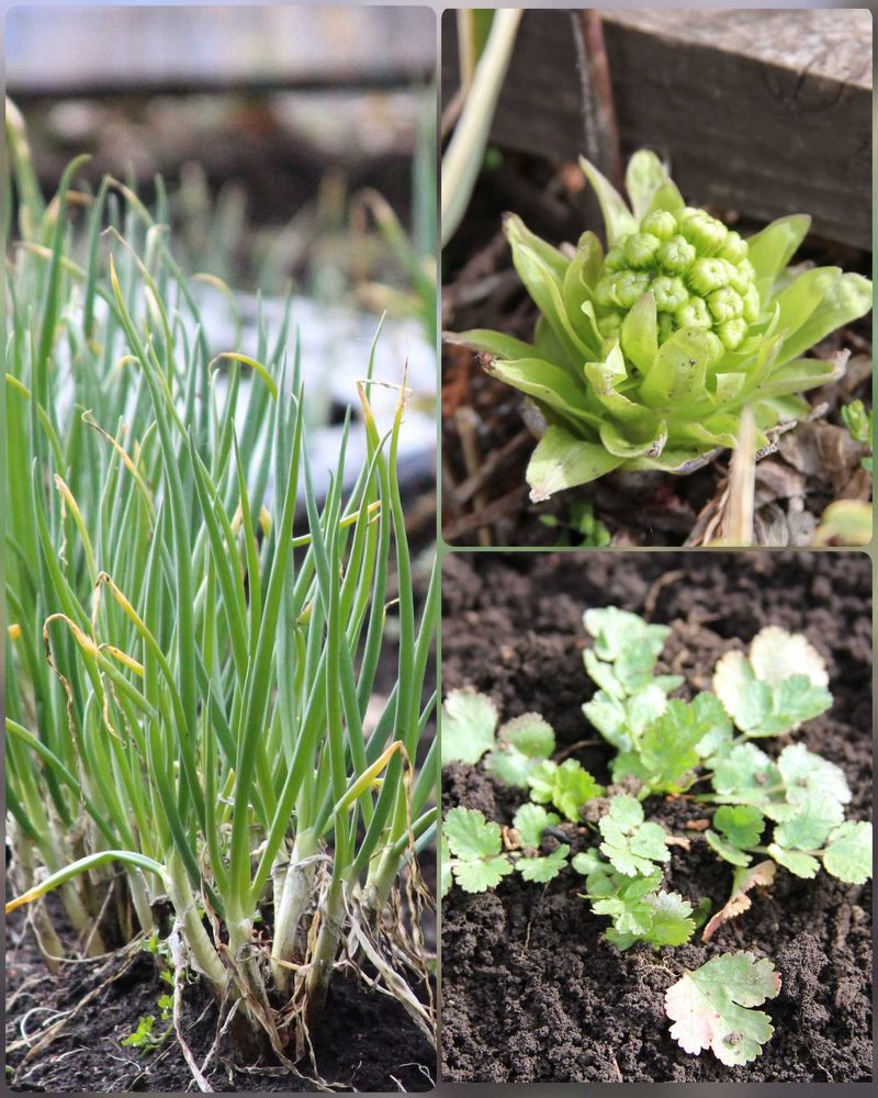 ワケギが青々として美味しそうです。畑の隅に蕗のとうも。
