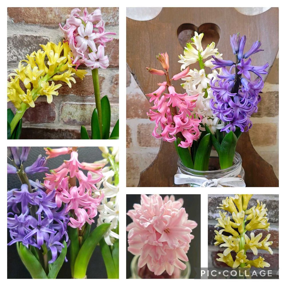 今日のお花🏷️の、ヒヤシンス🪻。今年の水栽培で咲いた花達🩷💜🤍💛。