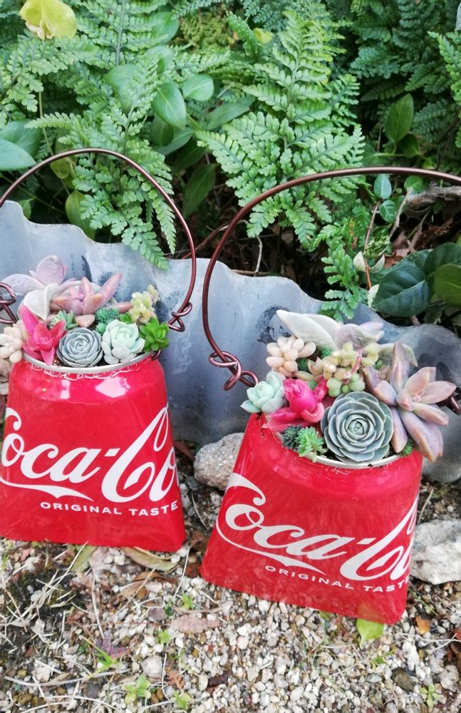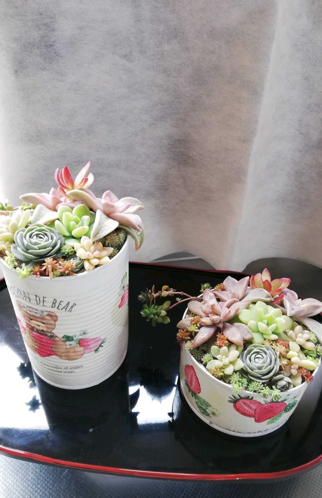 すうさんに頂いた 🐻ペーパーナプキンでデコパージュリメ缶寄せ植え2品を 作りました(デコパージュはほぼ🔰) 多肉は庭にある 強そうなものごちゃ混ぜ😂
