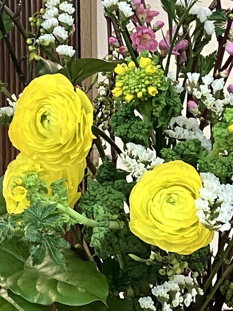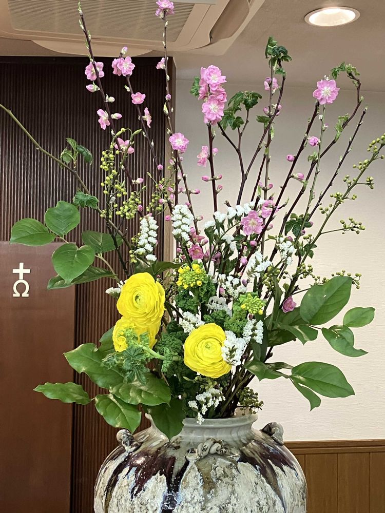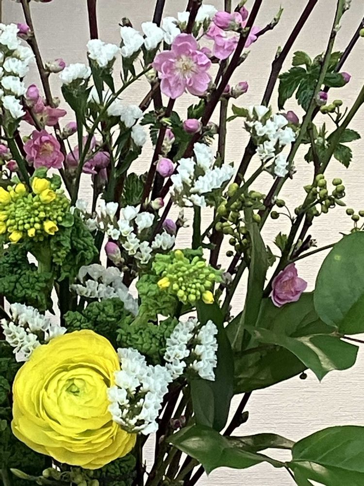 先週の教会の装花は、黄色のラナンキュラス、菜の花、桃の花、白のスターチスでした💐