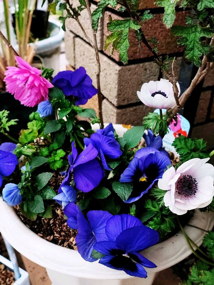 値下げアネモネとパンジーの寄せ植えもすごいキレイです。アネモネは結構ギュウギュウに植えても元気というか、単独で鉢に植えるよりも寄せ植えなどで他の植物が土の水を吸ってくれた方が元気な気がします。