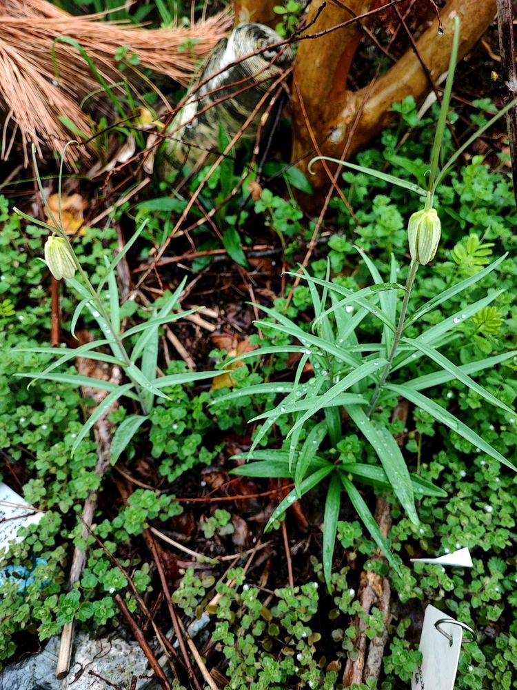 バイモユリも咲きそうです。上の方のクルリンとした葉っぱ?でほかの植物を支えにしながら伸びるんだそうな。どこまで伸びるのかなぁ...