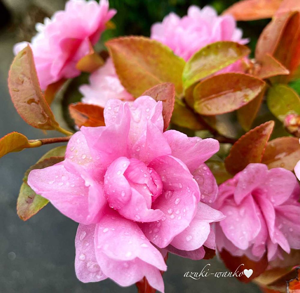 ピンク色ツバキさん華やかで美しいですね~~~💗💚💗💚💗💚💕💞💖