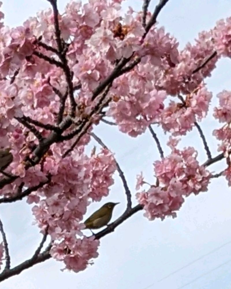 グリーン道路沿いに咲く河津桜ビンクが可愛い桜に可愛いメジロの桜ジローが一休み✌️