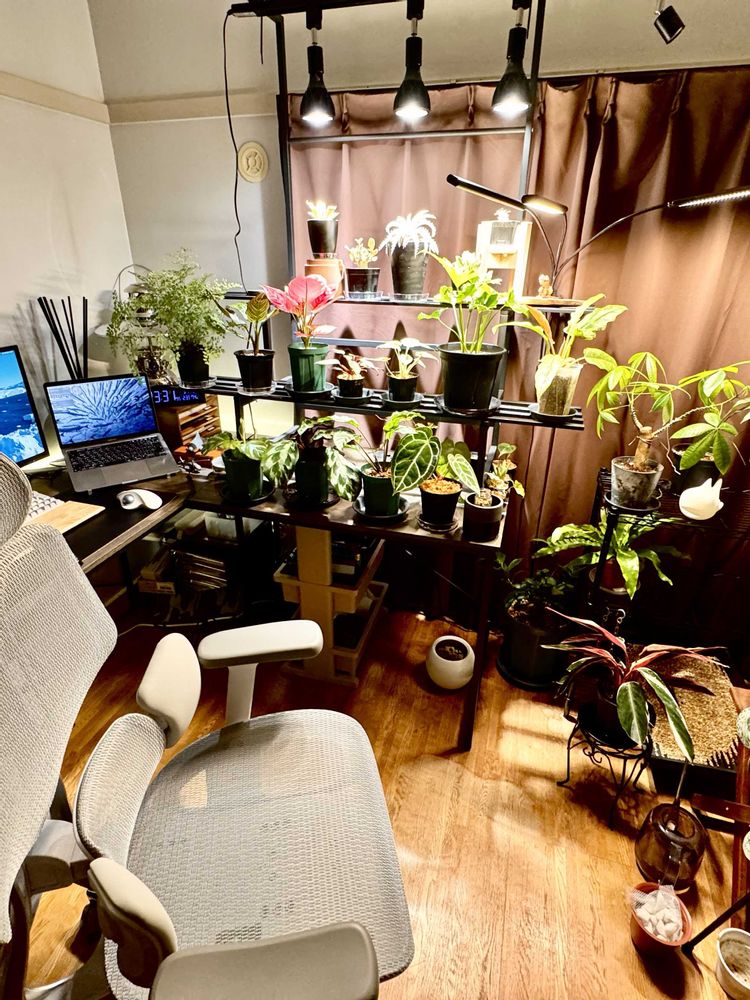 見切れているけど、濡れタオルにサーキュレーターを当てることででここ最近は湿度65%以上を維持している。引っ越したら加湿機買うけどこのままでも良い気がしてきた。パソコン💻とかには良くないのだろう。でも植物のため!!