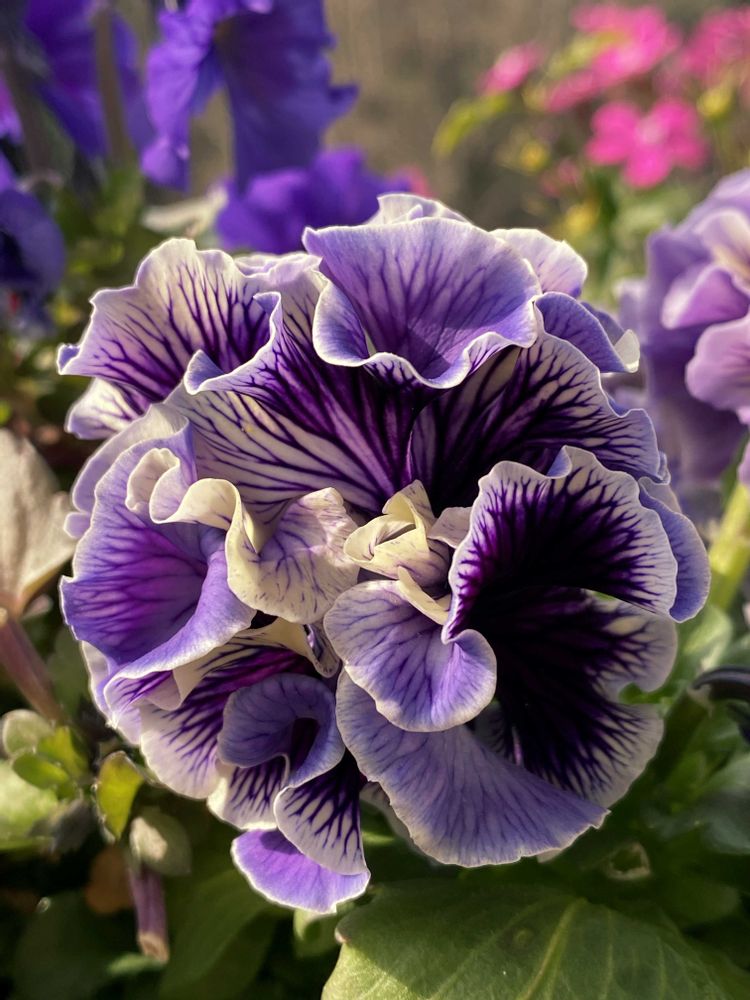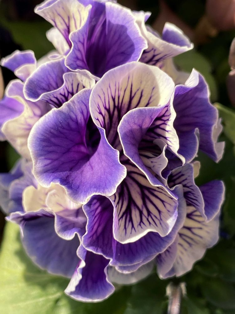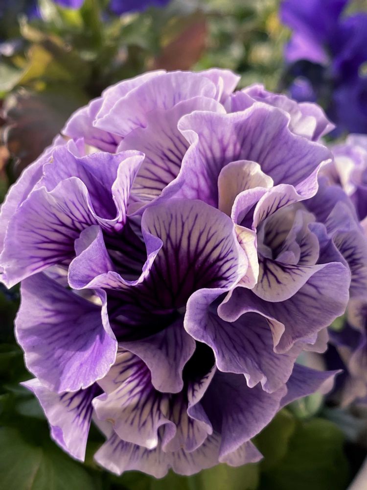 丸く咲いて上から見ると花弁のウェーブがとても魅力的なパンジーです💜🤍💜
