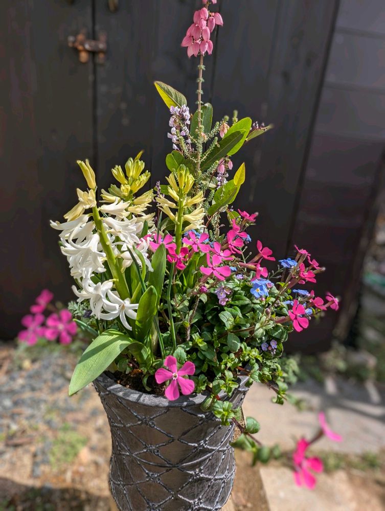 ①寄せ植え②ヒヤシンス ③ミオマルク シレネ④ミニアイリス⑤ハーデンベルギア