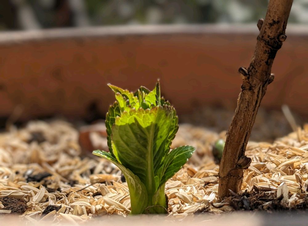 この花壇にはもうピンクの八重咲き秋明菊の小さな新葉が沢山出ていました