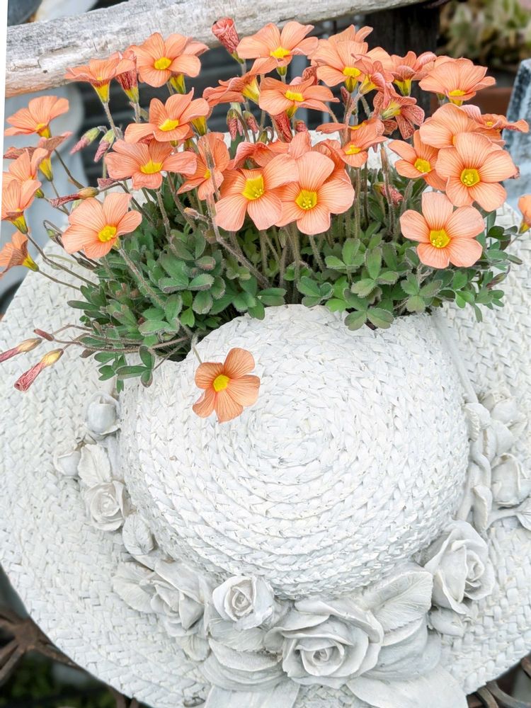 白い帽子👒鉢にオレンジ色のオキザリスが映えるね〜綺麗🧡🤍