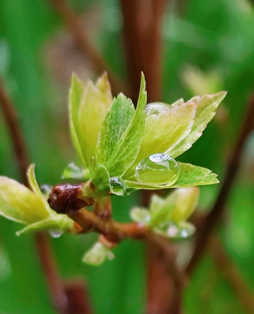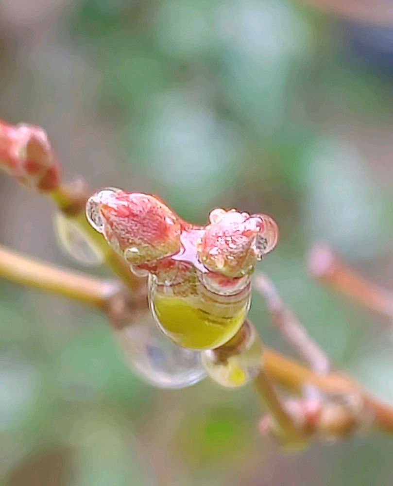 ①②モミジの硬い紅い芽を包む雫の色が鮮やかな萌黄色…はて?