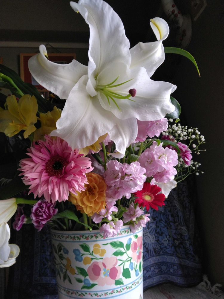 *💐花束、中3の孫が部活の先輩から、卒業のお祝いに戴いたけど、猫がいるので(百合は猛毒らしい😓)家に飾れないとの事で貰ってきました🥰💕