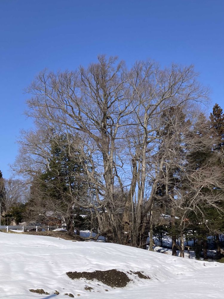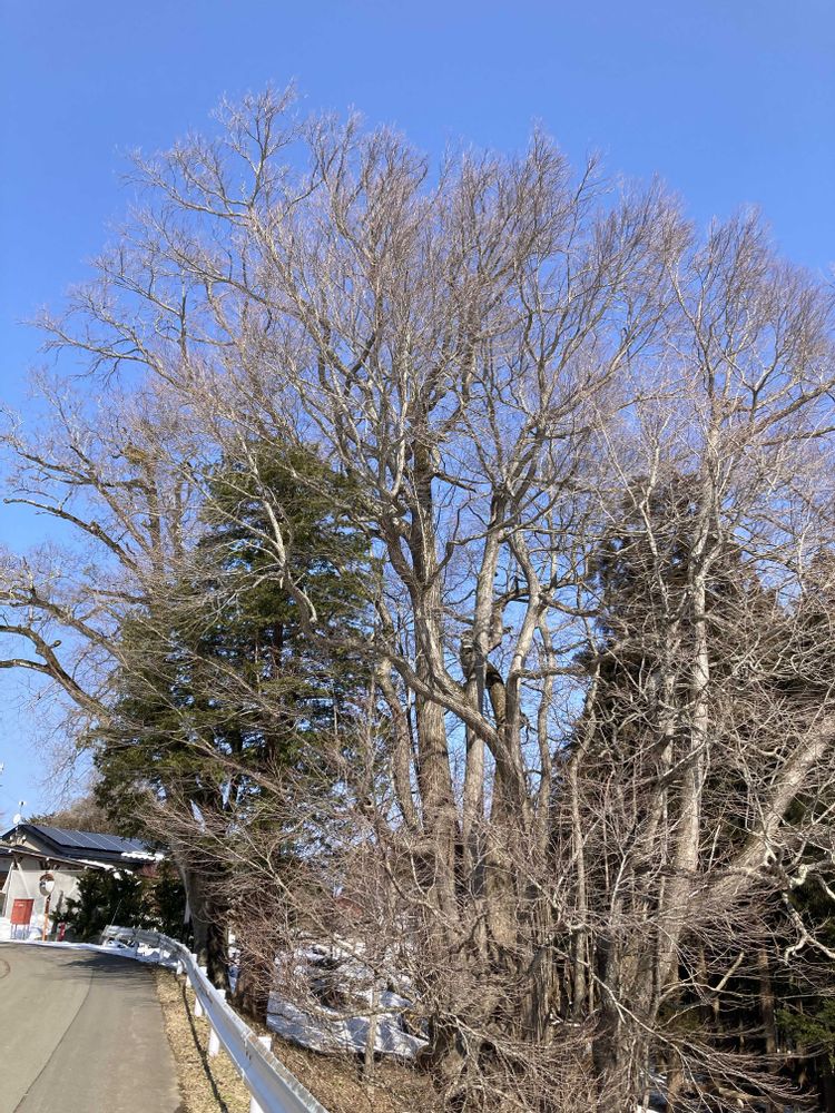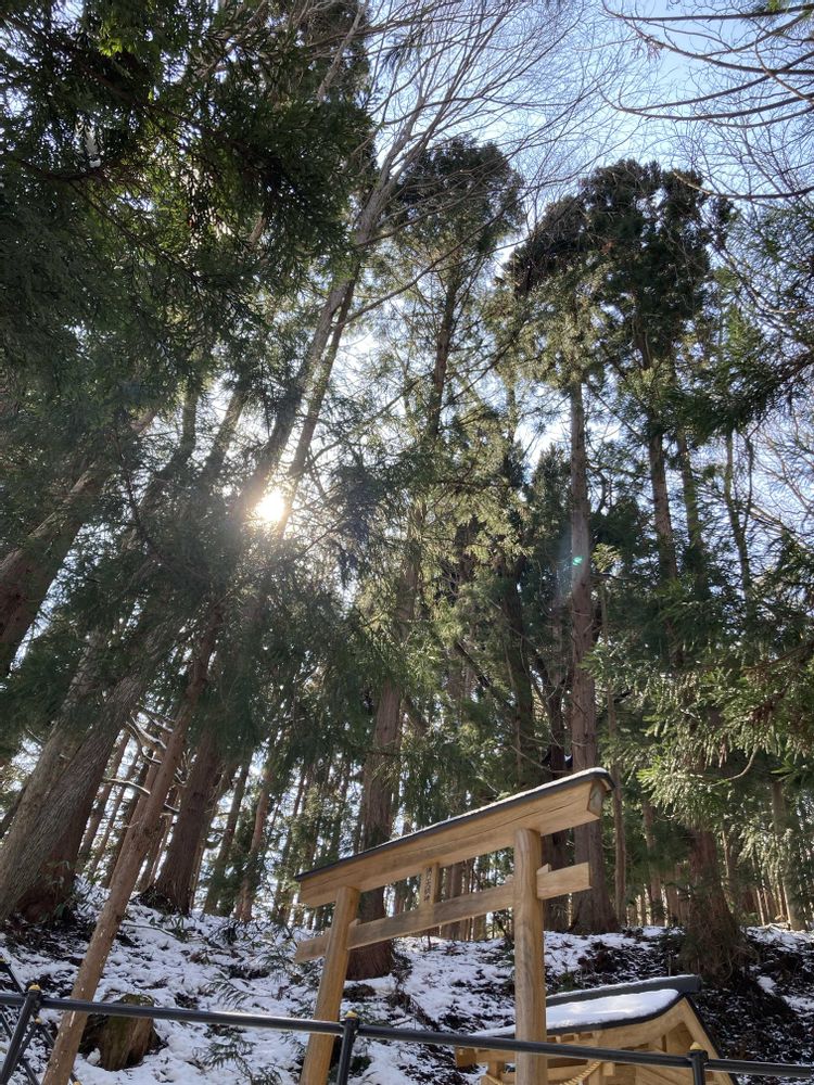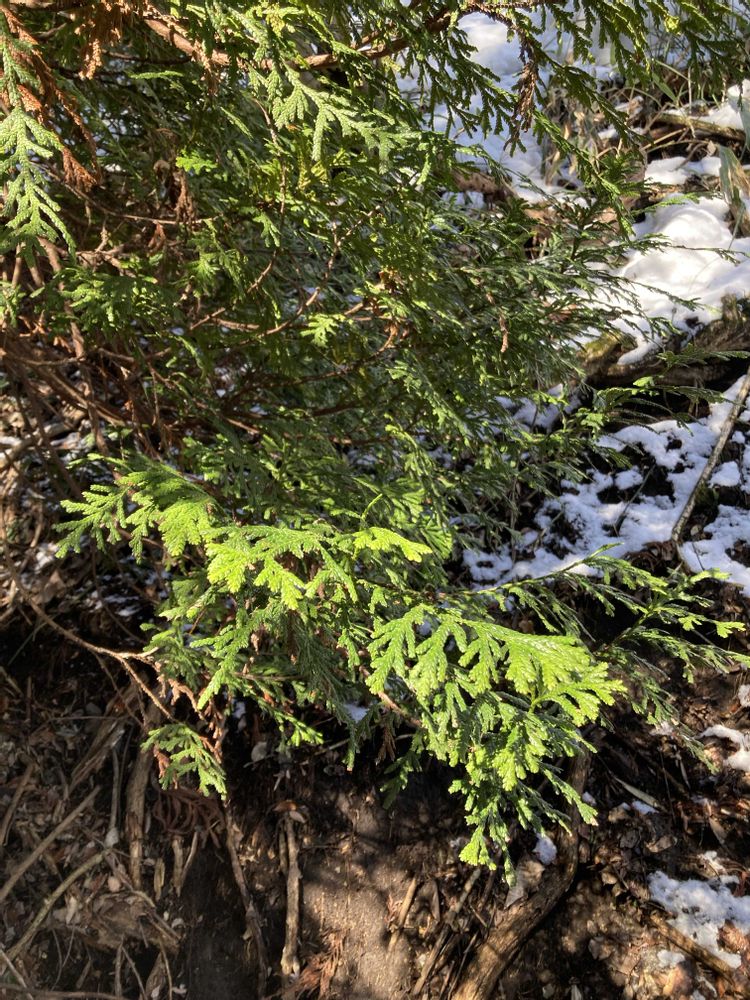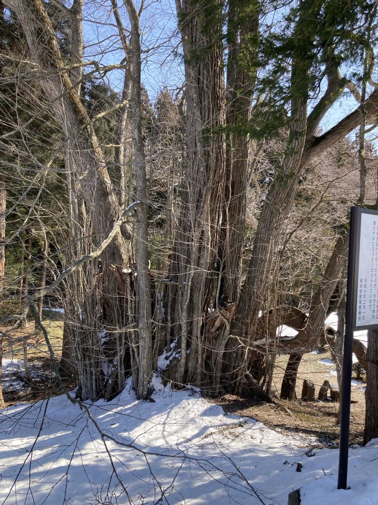 天然記念物「千本桂」といわれる桂の木。その近くには湧水が湧いている神社があり、ヒバの葉が輝いていました。