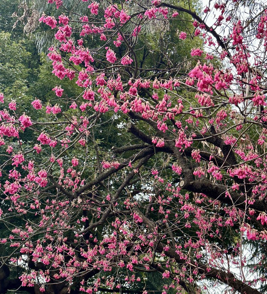 鮮やかな濃いピンク色のカンヒザクラは、早咲きでうつむき加減にふっくらと花を咲かせます。周囲がぱっと明るくなる素敵なサクラです。