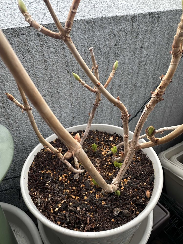 ベルギアの蕾にグーズベリーと紫陽花の新芽🌱