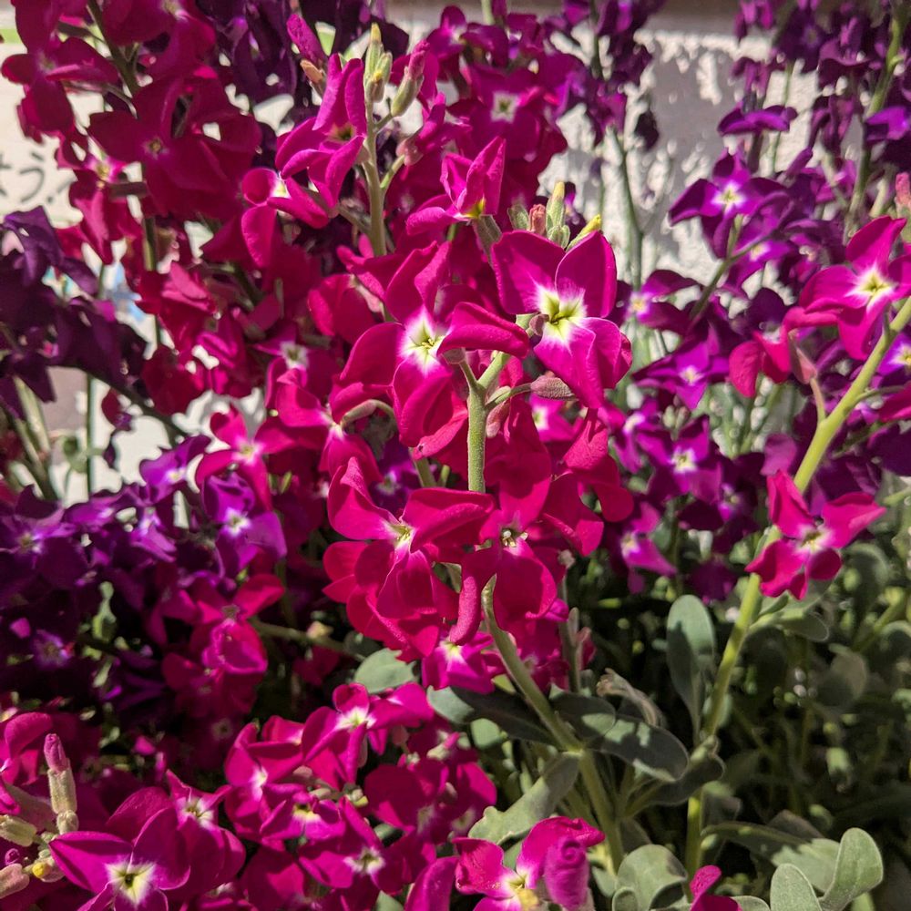 ストック、金魚草と、あおいちゃんです😄図書館の花壇です😄いつも綺麗で、心なごみます😄