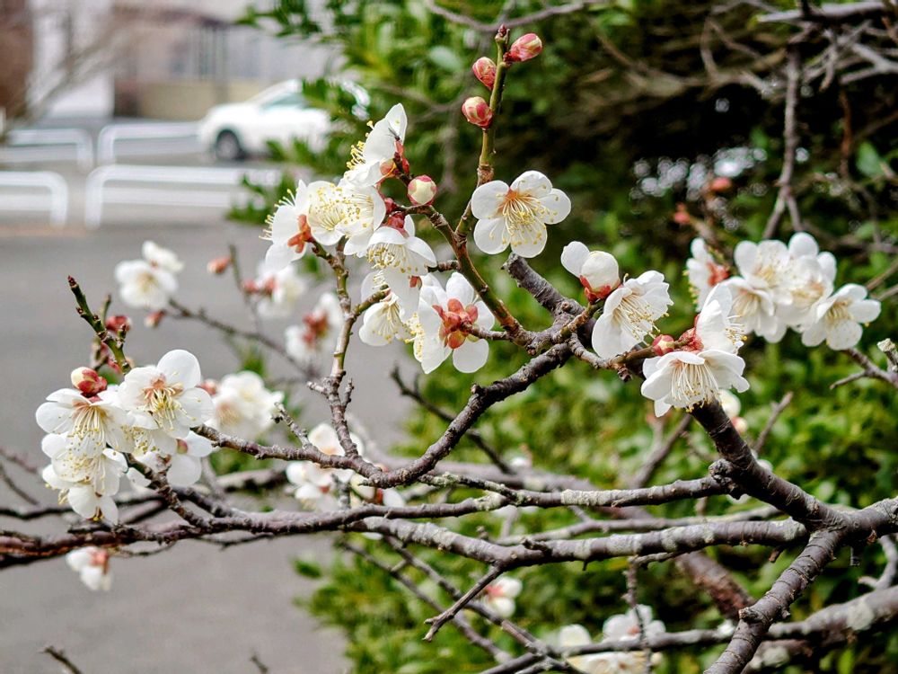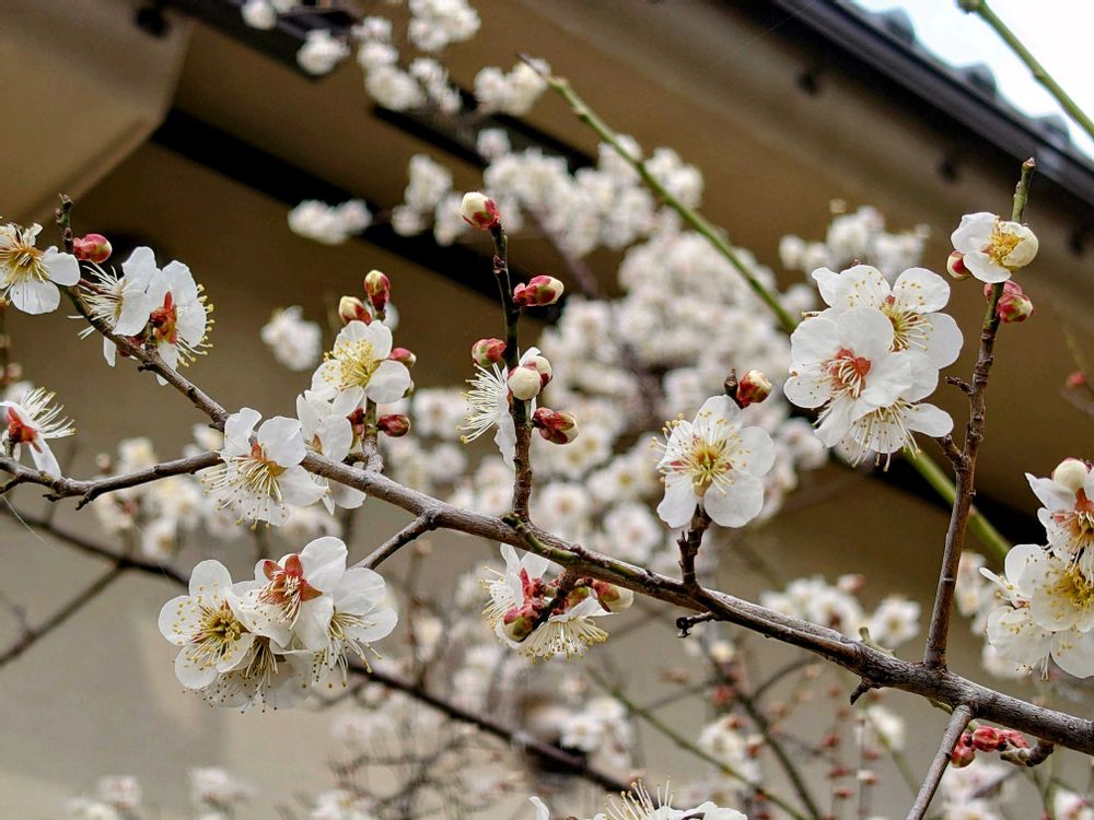 今日の午前中、市内を散歩途中に見かけた白梅。