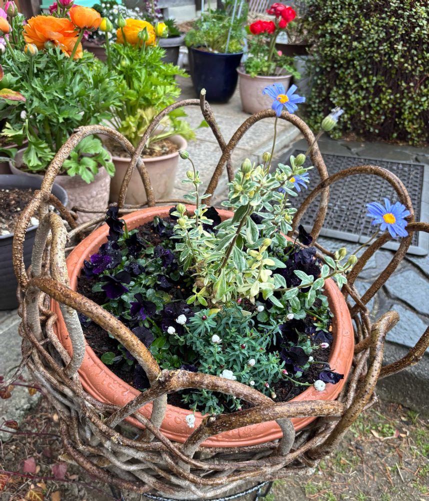今日はお昼頃から雨が降り出しました☔昨日、隣町の木曽川沿いの林の中で藤蔓を採ってきて鉢カバーを作りました😊本当は2月頃に採るのが良いそうだという事ですが寒いのでついつい遅くなってしまい、やっと昨日採りにいきました😃