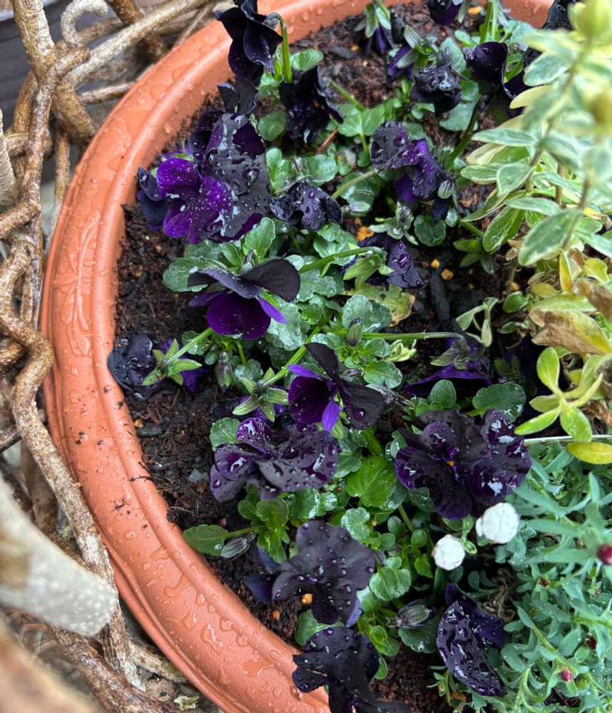 オシャレ色のビオラもペーパーカスケードも雨に濡れて寒そうです😨